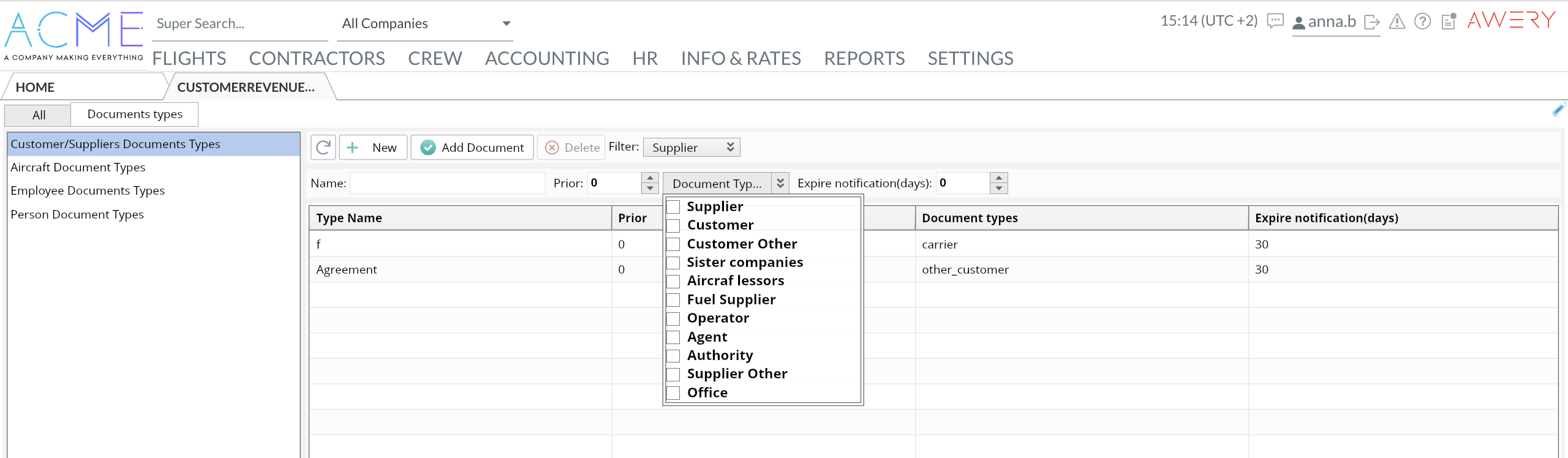 To add a new type of Customers/ Suppliers document fill the name field> Choose the priority of indication in the list> Tick a specific document type/ types it refers to (when search among types use a filter)> Set an expiration date (as a feature the system will automatically notify and show the alert if the expiration date is coming or the document is expired)> Click 'Add document' (after saving a new document type you can update it: change the required filed and click 'Save document')