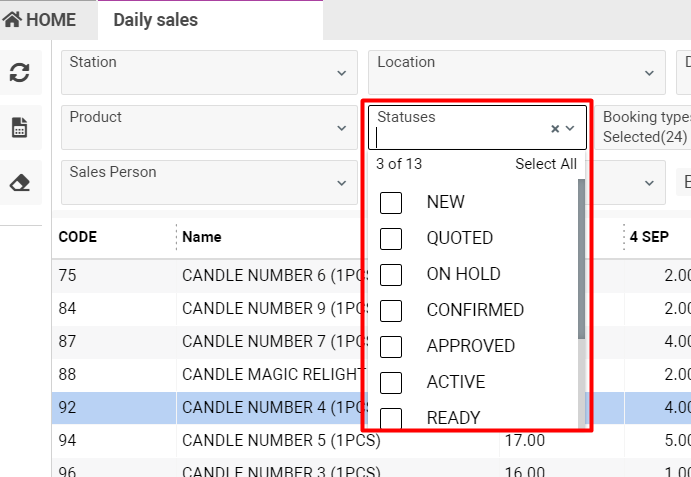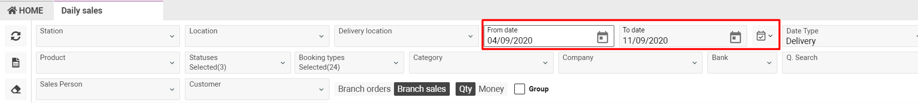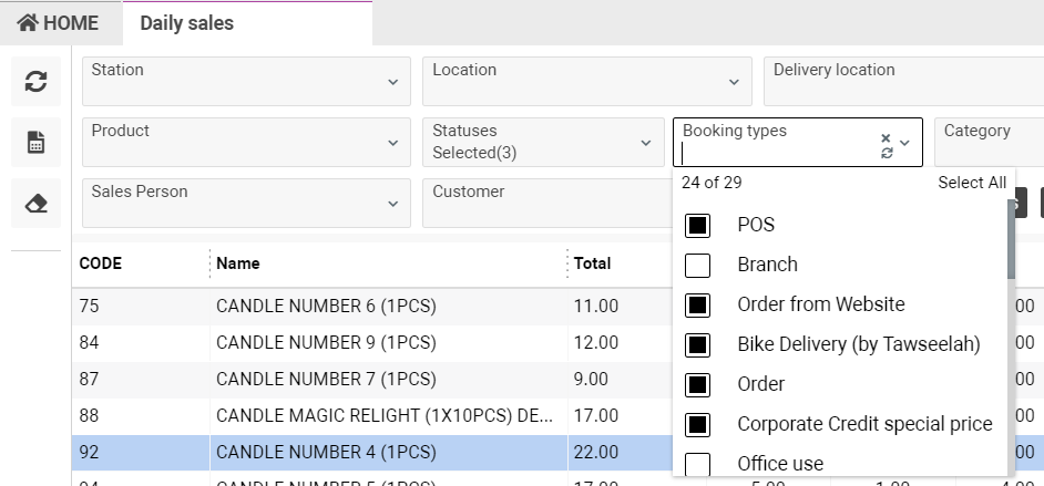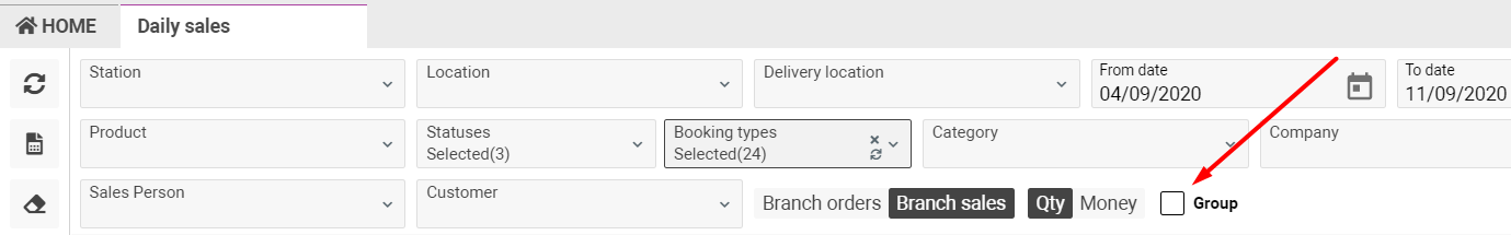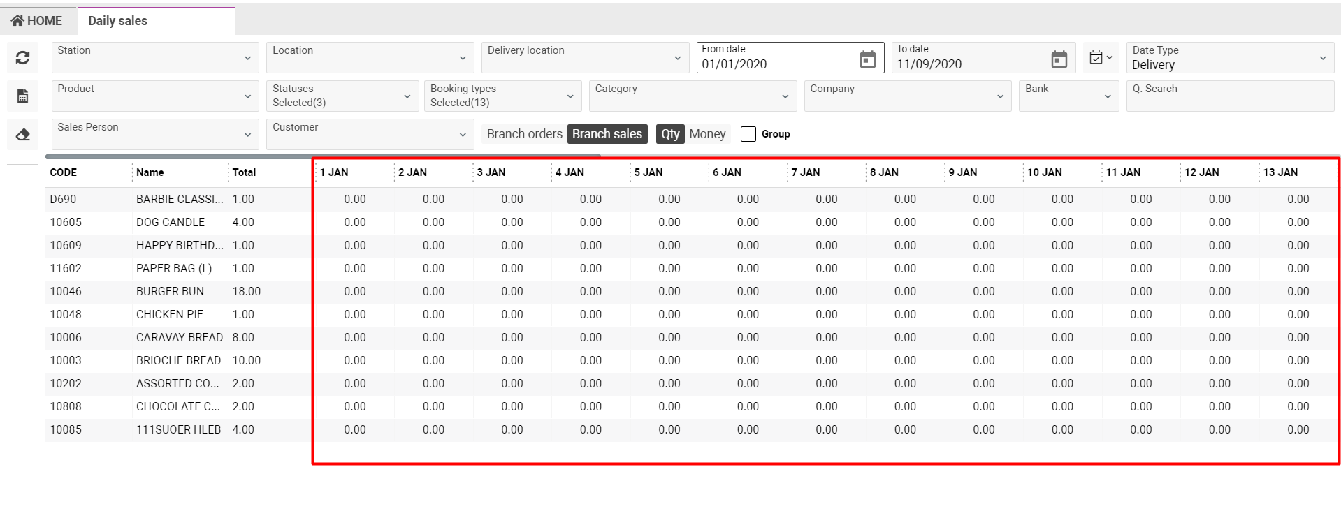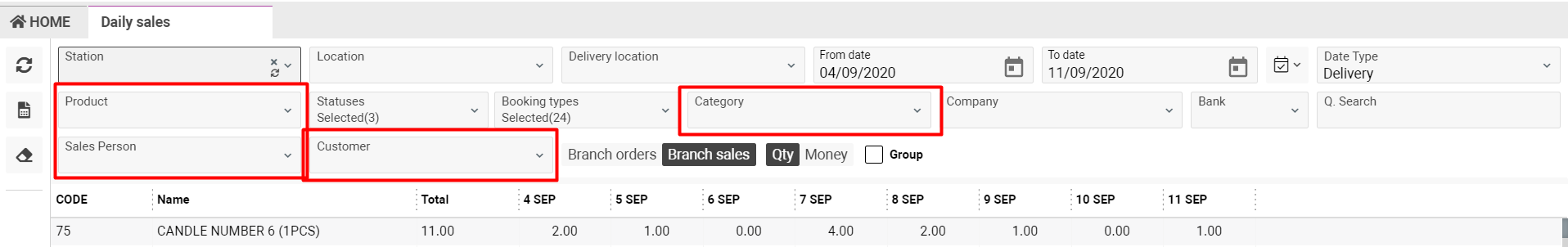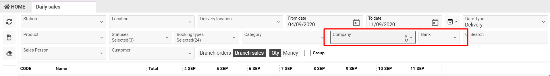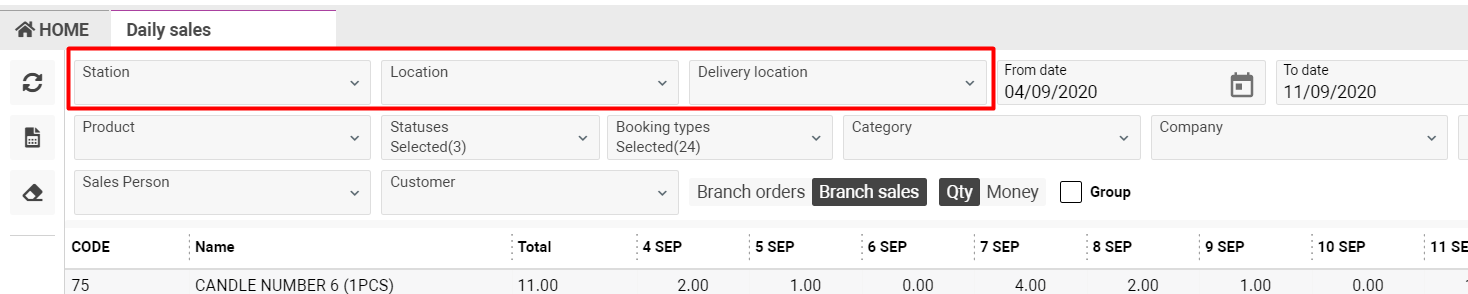 - Branch sales - using the Branch sales button will be available a list of records of the sales department