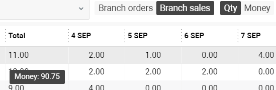The Total column will be displayed the price of all orders and in the tooltip their number.