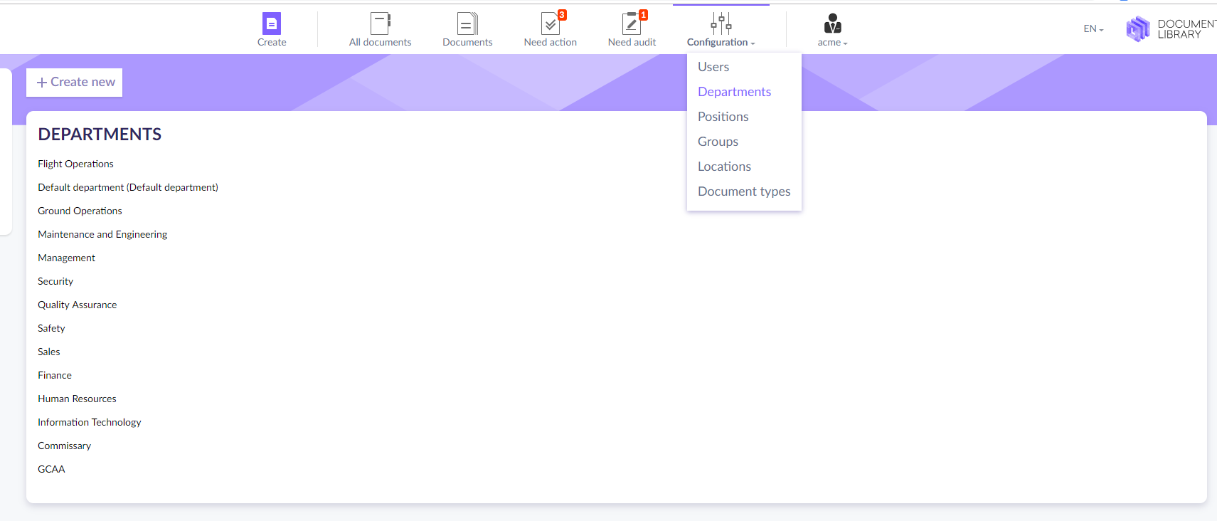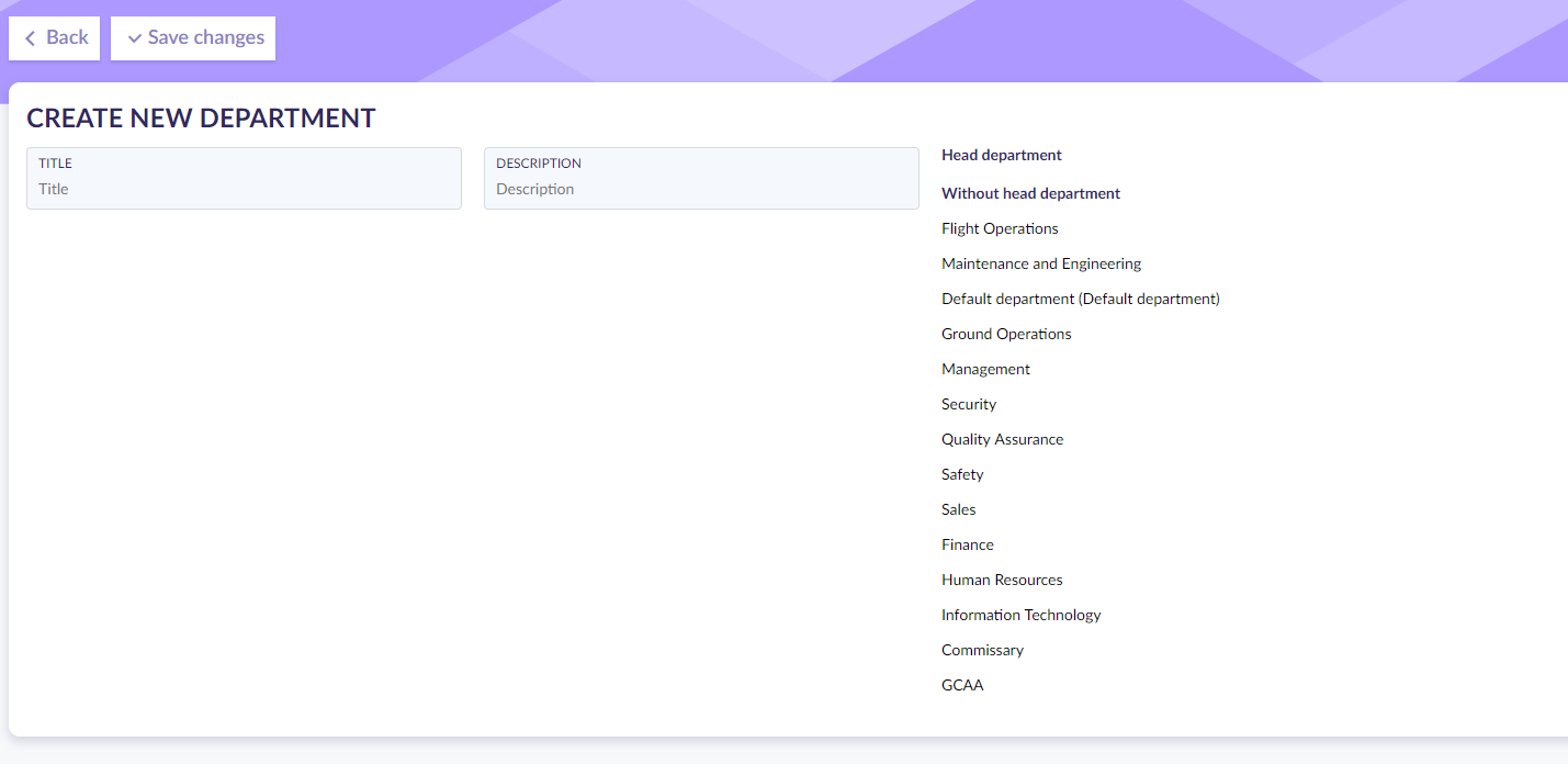 To add a new department, click Create new, add Title and description if needed. Chose head department and press Save changes.