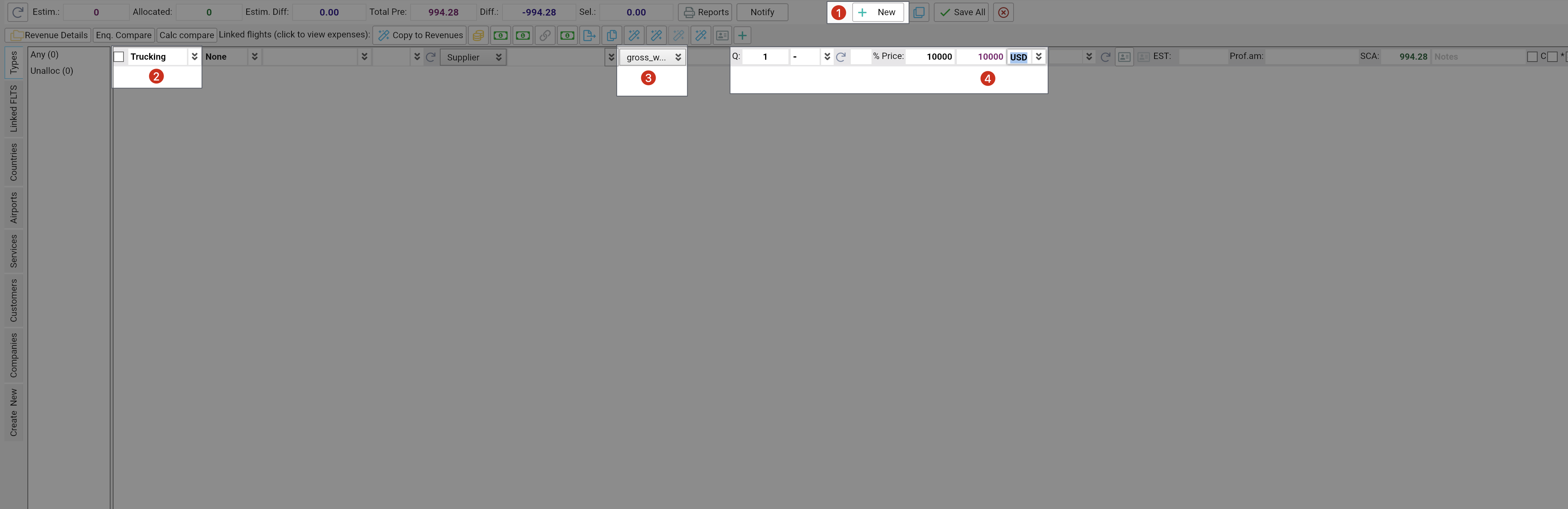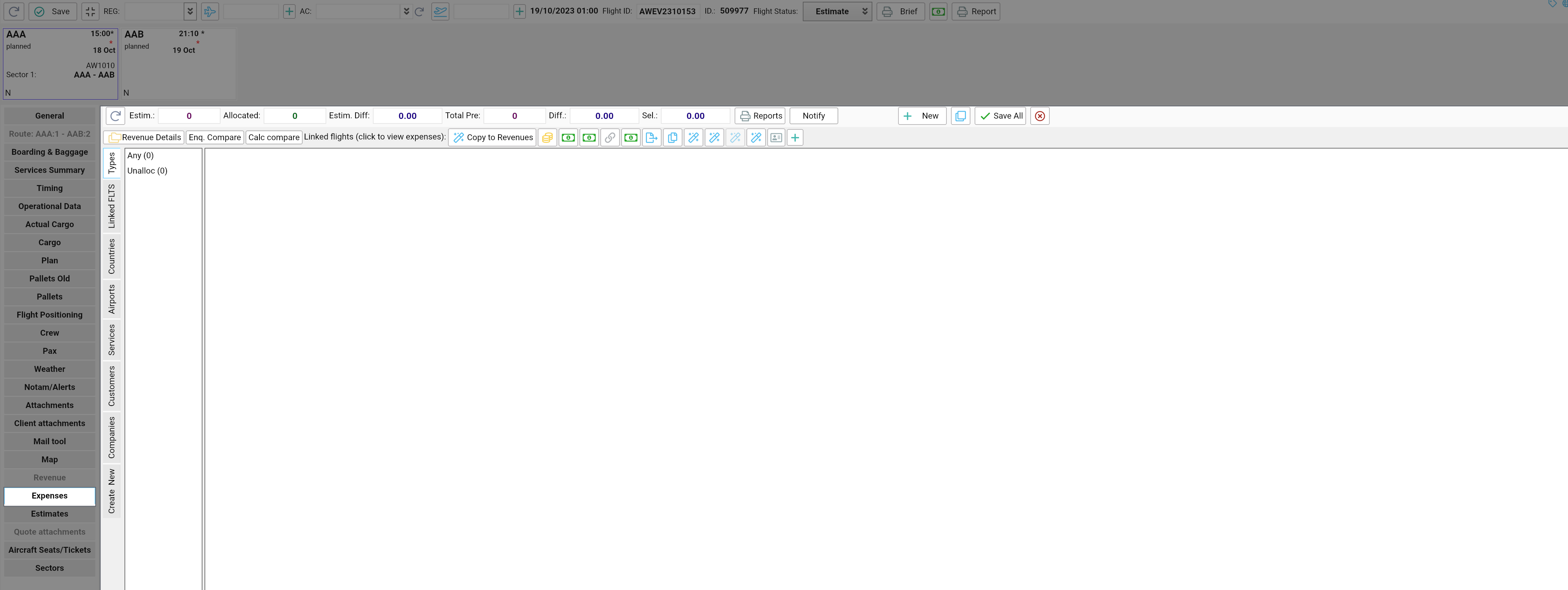 Navigate to the `Expenses` tab of the Flight interface, where you can fill in all the costs entries for whole flight.