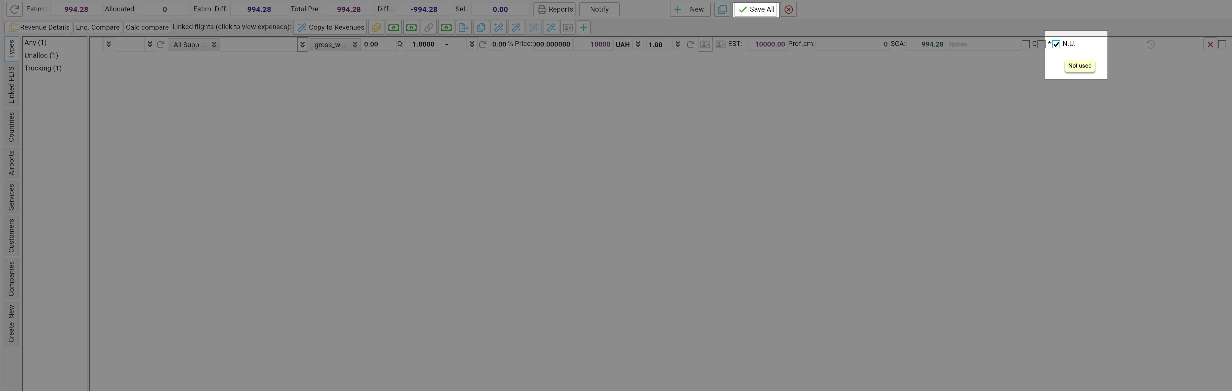 Save Expenses using the `Save all` button. After it `Not Used` marker will be filled for the cost entry where `Distributed By` option is selected. It will be excluded from the main calculations.