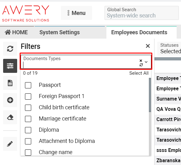 The Employee Document Types module allows users to create and edit different types of employee documents used for record-keeping and compliance.