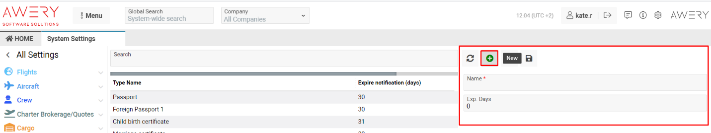 Open the Document Types list for the first time or press the "+" button to add a new entry.