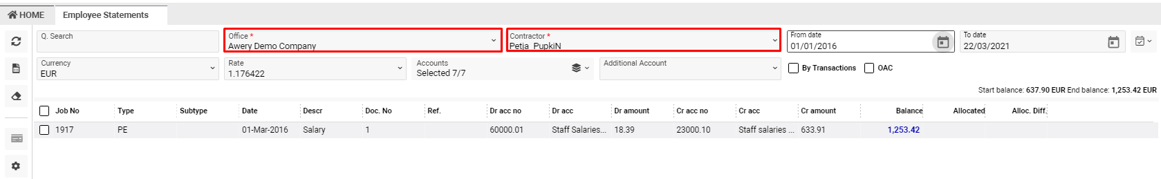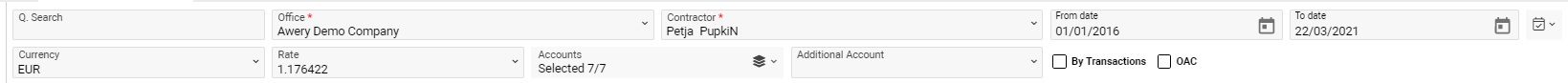 Office, Contractor, Currency, Rate, Accounts Additional Account, Special Documents selectors. Pay attention that the Office and Contractor fields are required.