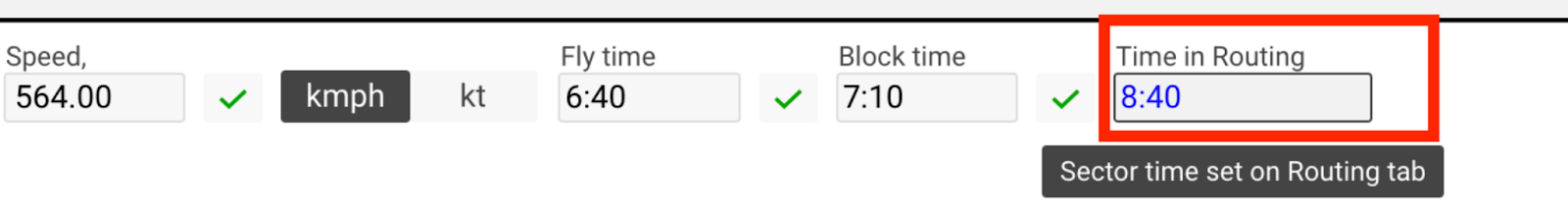 the field is not available for editing, it is calculated in the same way as it is implemented on the Routing (Flight Time) tab, when you hover, display a type with the text Sector time set on Routing tab