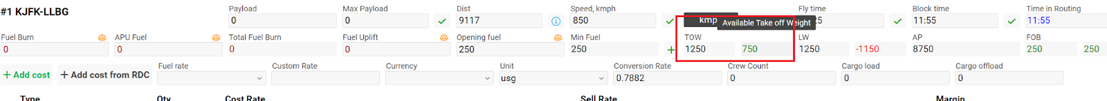 TOW - when hovering over the black color - Take off Weight, red - Take off overload, and green - Available Take off Weight - the value mzfw from Reg no if not found then from AС type is displayed here, if not received, then 0, then Payload, if 0 - it should be in brackets (- with the value mzfw), if you enter a value in Payload, it should be added to the data, Fuel Uplift is also added to the data, plus if the Minimum fuel on board (MF) is filled in the aircraft, then we add it to the data, further, MTOW (Max takeoff weight) kg.
