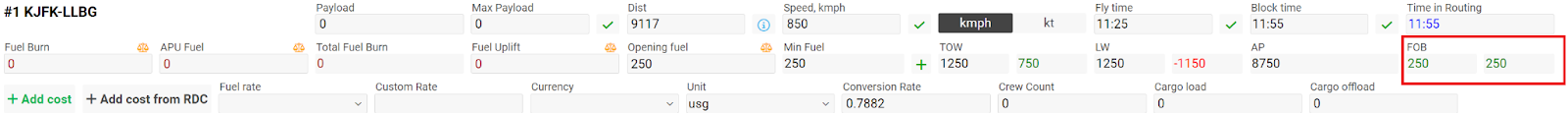 Fuel Uplift, kg - the sum of all sectors of the option in the Fuel Uplift field