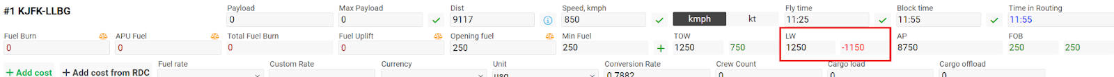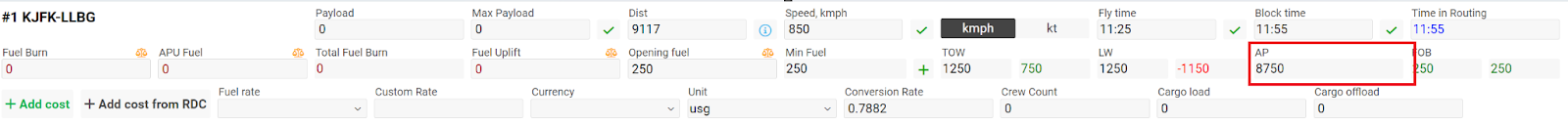 AP - Available payload = MTOW - EW - Min F - FU - P ) = (MTOW (Max takeoff weight) kg (this parameter is taken from reg no, if it is not filled in there, then from the as type) - “mzfw” Empty weight - Min Fuel) then minus Fuel uplift then minus the entered value Payload = Available payload, if all parameters are empty, then 0 will be displayed accordingly
