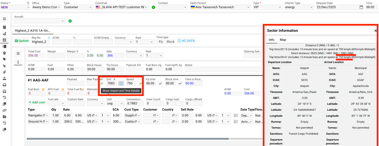 Dist і Speed - are calculated according to the selected aircraft type