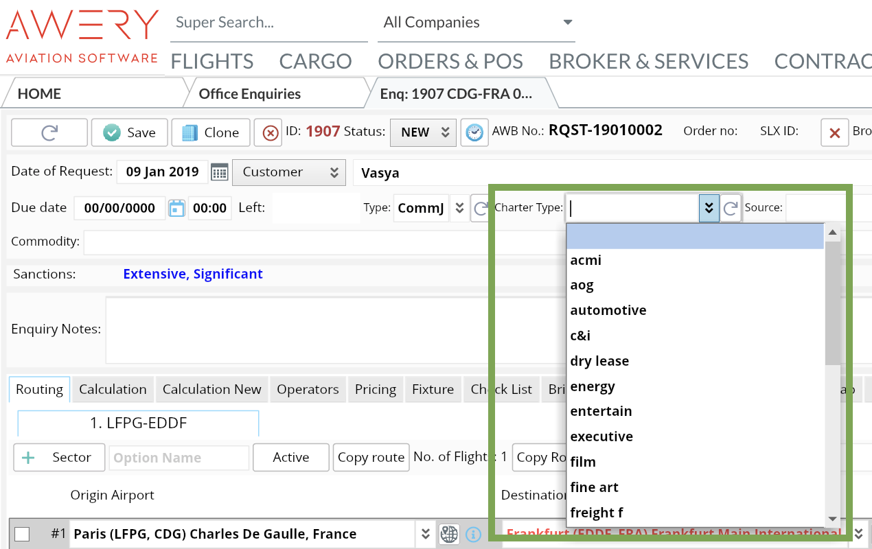 - Entering "Origin-Destination" ICAO and IATA codes, country or city names