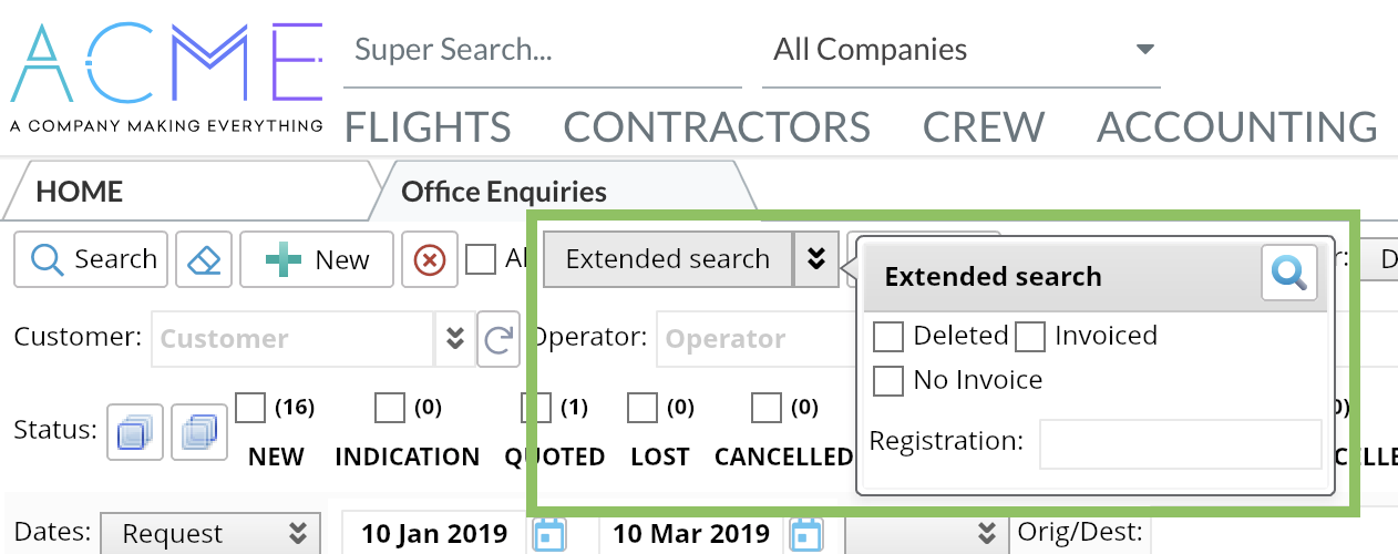 - Additional option of the extended search allows to find and check any necessary information from the Deleted enquiries, filter by Invoiced and earlier created but yet Not Invoiced ones.