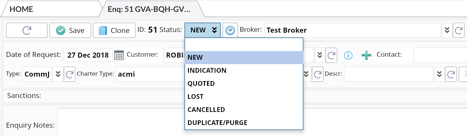 The Enquiry status field helps all brokers inside company to understand at what point an Enquiry is currently at. It's also used for Enquiry Search Filters and Enquiry history of creation.