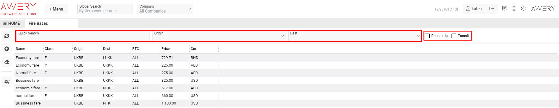 Quick Search field - available parameters for the search are: name, class, origin, destination, PTC, price, currency