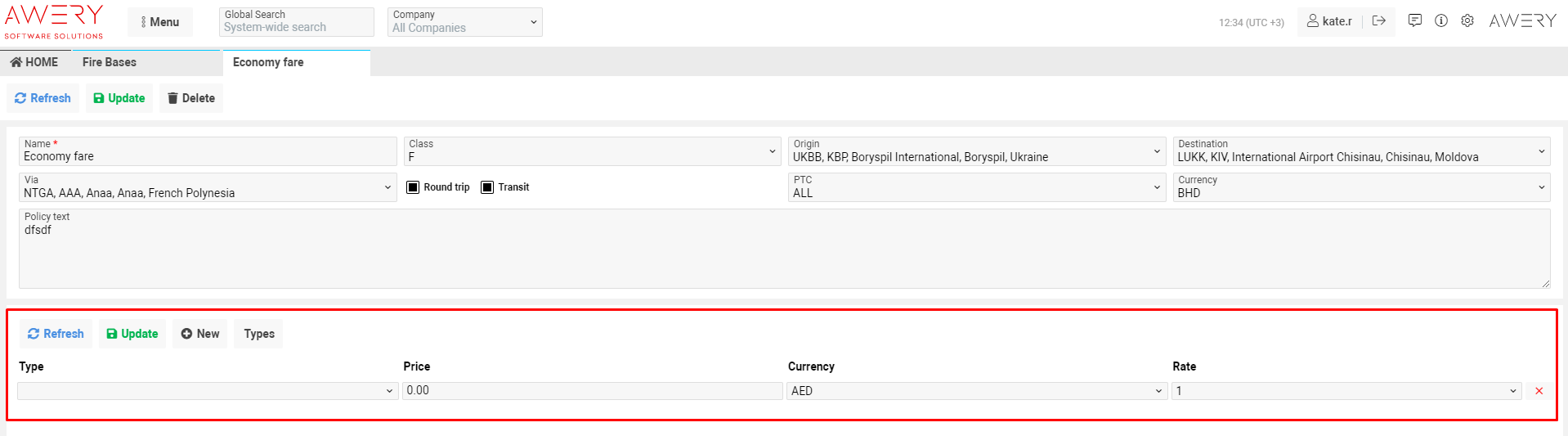 The Fare Bases interface allows you to view the list of previously created entries, edit them and create new fares