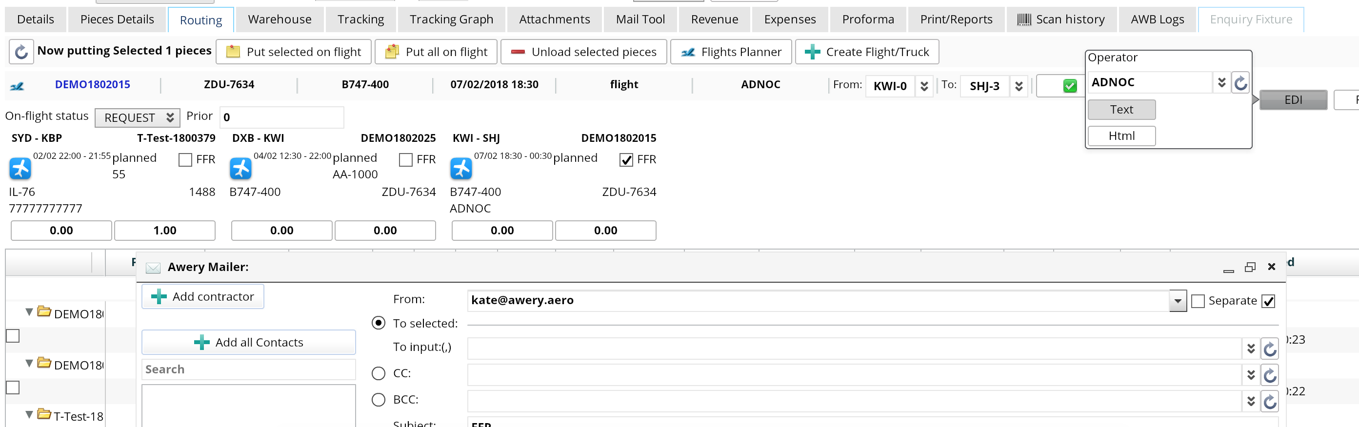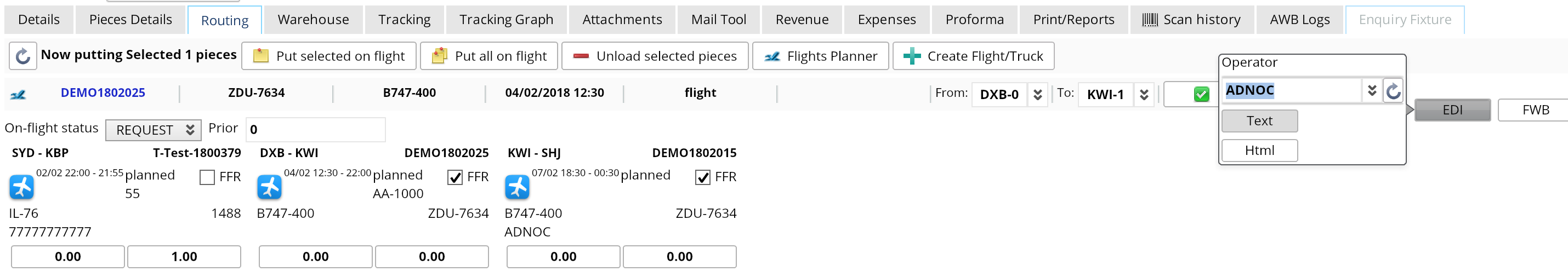If the AWB is planned on several flights, you need to choose the one or several for which you need to send the movement template, tick FFR and press EDI message button. Operator will be picked up from flight, but if you selected several flights from different operators, please also select Operator manually.