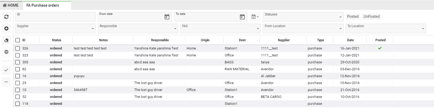 The current page displays FA Orders filtered by the type "purchase". Select any FA Order by double-clicking on it.