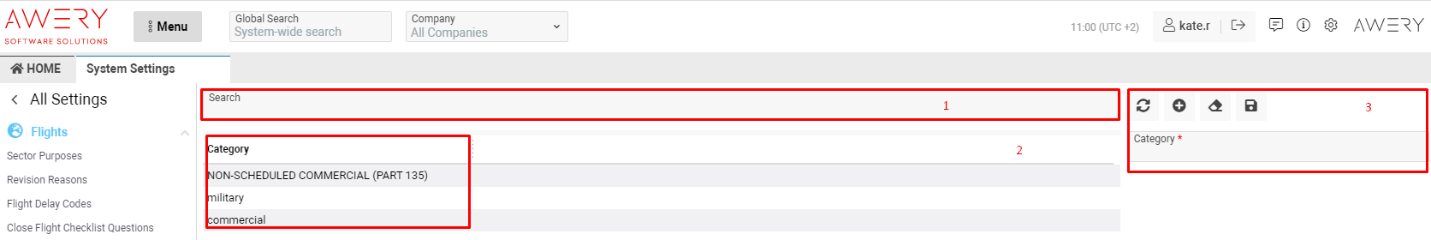 The Flight Categories section allows users to classify flights based on the services the company provides.