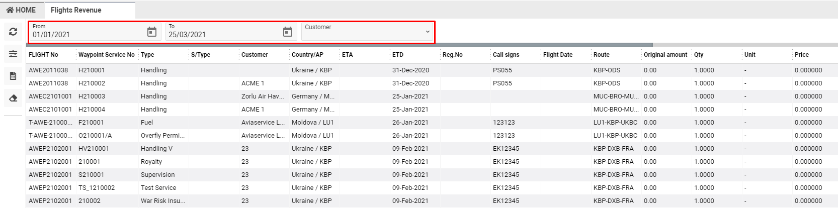 Allows you view all Flight Revenue, filter items by different parameters, export reports