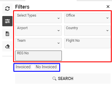 - You can make filtration by additional parameters in the Filter-bar: Service type, Office, Airport, Country, Team, Flight No, Reg No