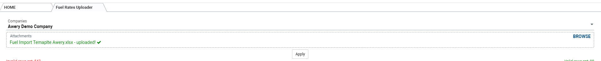 To import fuel rates, simply chose the company, browse the filled XLS file and click Apply. Download the template for fuel import here Fuel Import Temaplte Awery.xlsx