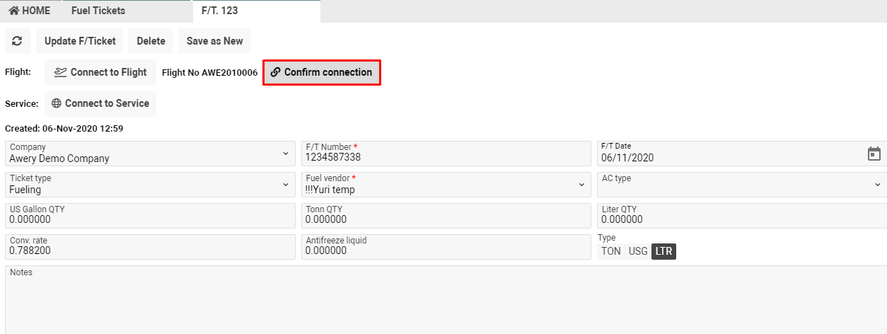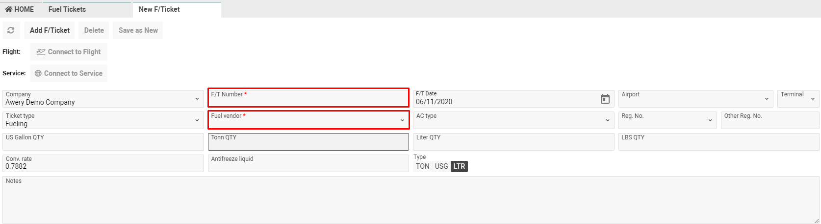 - Pay attention that the F/T Number and Fuel Vendor fields are required.
