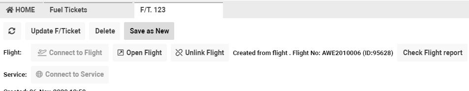 This interface allows you to create the fuel ticket and to fill in all the necessary information about it. There you can assign suppliers and note the quantity of fuel in USG, TON, LTR, connect the ticket to a flight or service, upload a screenshot and check the information in the flight report.