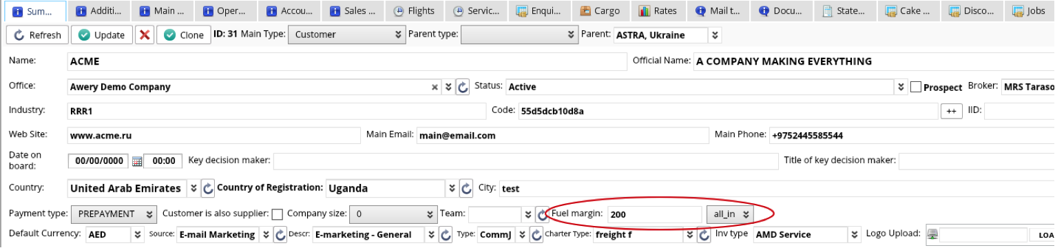 For each Customer Fuel margin can be set. Open Customer > Summary tab (or Accounting tab – depends on individual set up for each installation)
