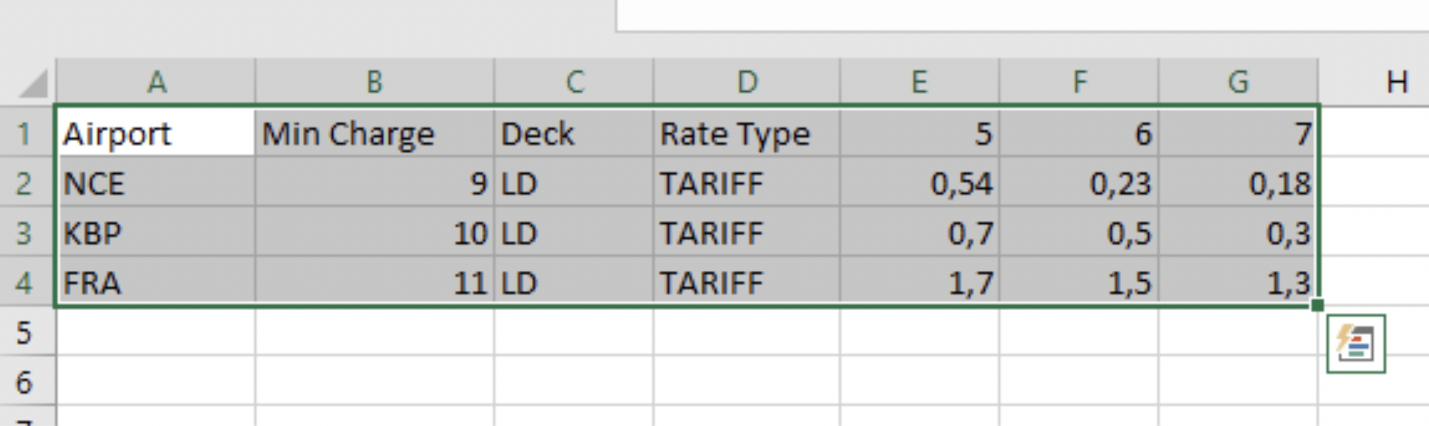 The Copy-Paste feature allows you to transfer destination, minimum charge, deck position, and rate type information from your Excel file to the rate sheet. To ensure correct formatting, please adhere to the following: