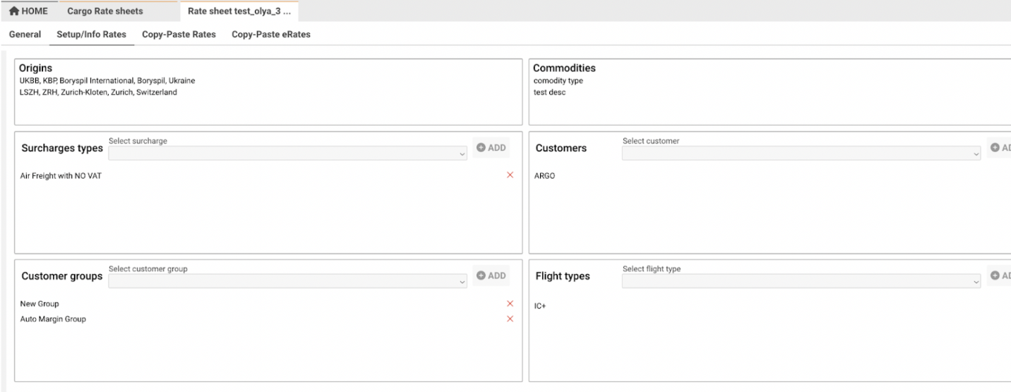 You can add origins, commodities, surcharge types, customers, customer groups, and flight types.