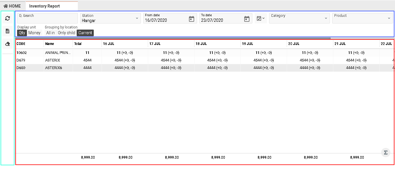 Total – the amount of the product at the end of the selected period. In case the total amount ≤ minimum stock, the text will be highlighted in red.