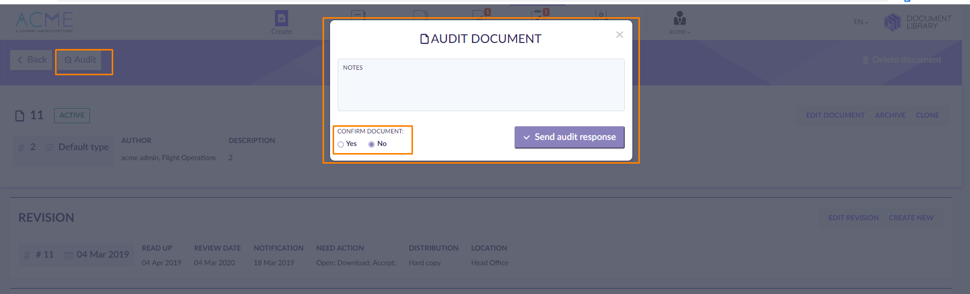 Open a document by clicking on its title. When you are ready with confirmation decision for the document, press 'Audit'. On the new window, you can confirm or not confirm the document and leave your feedback.