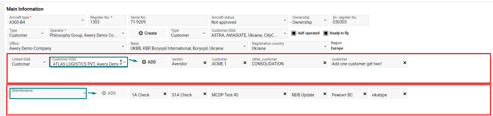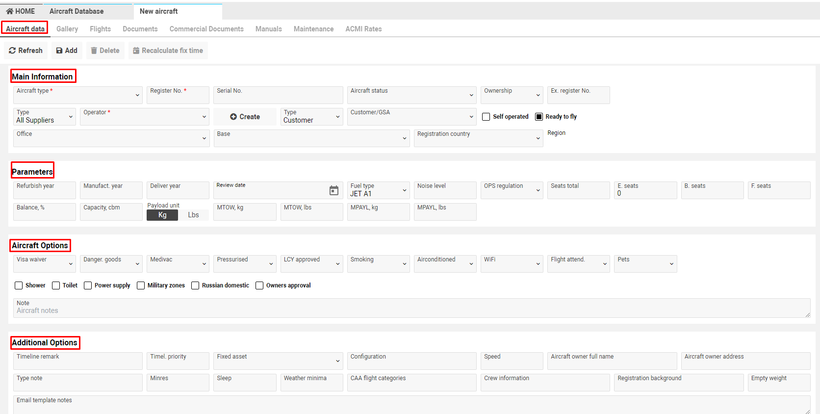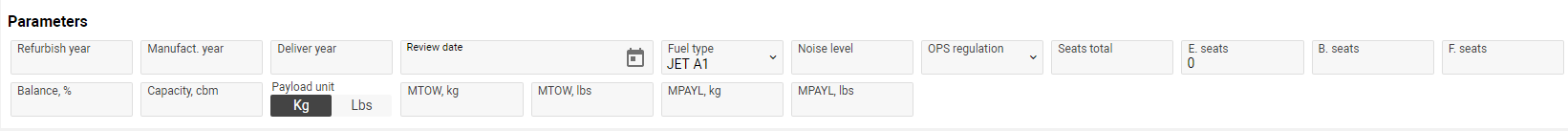 The section is optional. Here you can fill in information about Refurbish year, Manufacture year, Fuel type, OPS regulations, Capacity, Payload, Payload Unit, etc