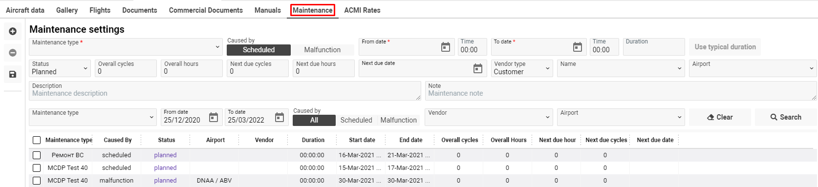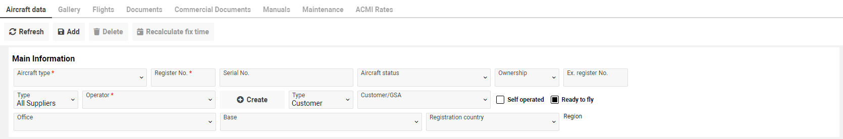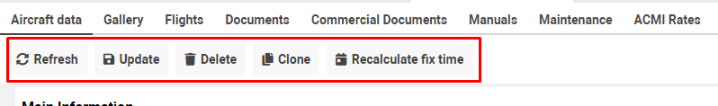After saving a new aircraft you will be able to Delete, Clone, Update data, Recalculate fix time by using the corresponding buttons