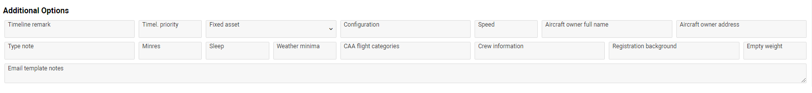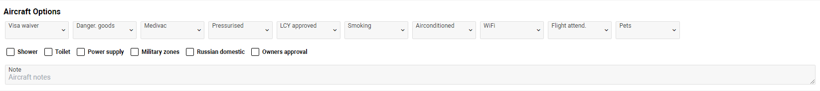 The section is optional. Here you can add notes and details about Aircraft owner, Crew information, Speed, Configuration, etc