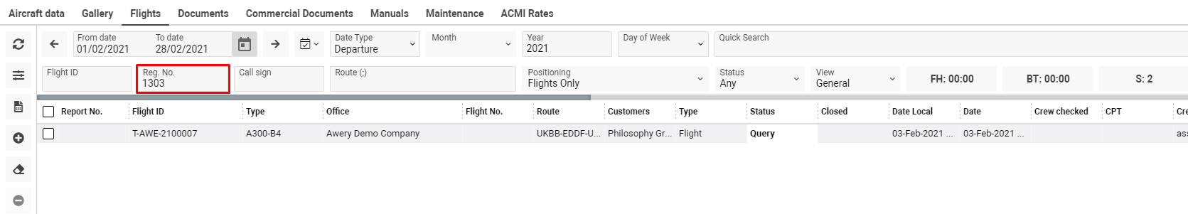The tab shows all the flights that the selected plane has made. Functionality and permissions are the same as on Flights Database.