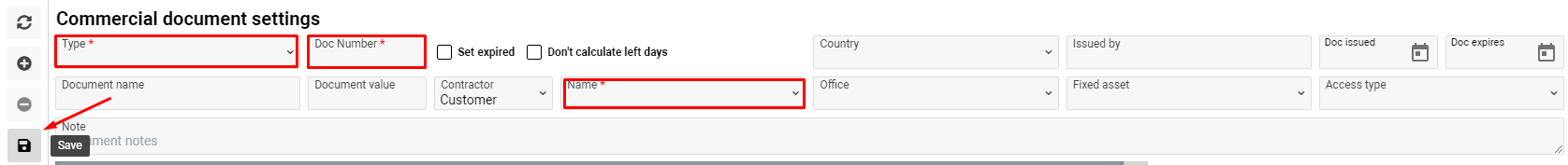 Type, Doc Number and Contractor name are mandatory fields, other fields are optional