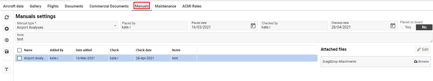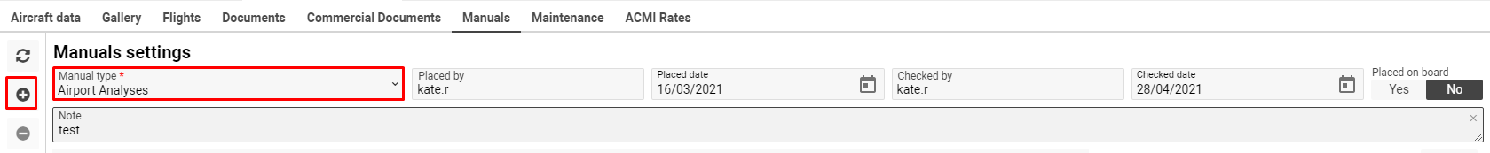 You can specify manuals for a particular aircraft, where they are placed, check date.