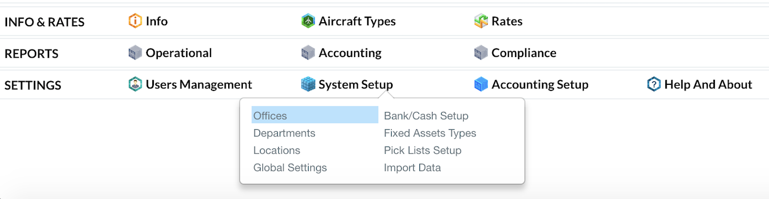 Home→ Settings→ System Setup→ Offices