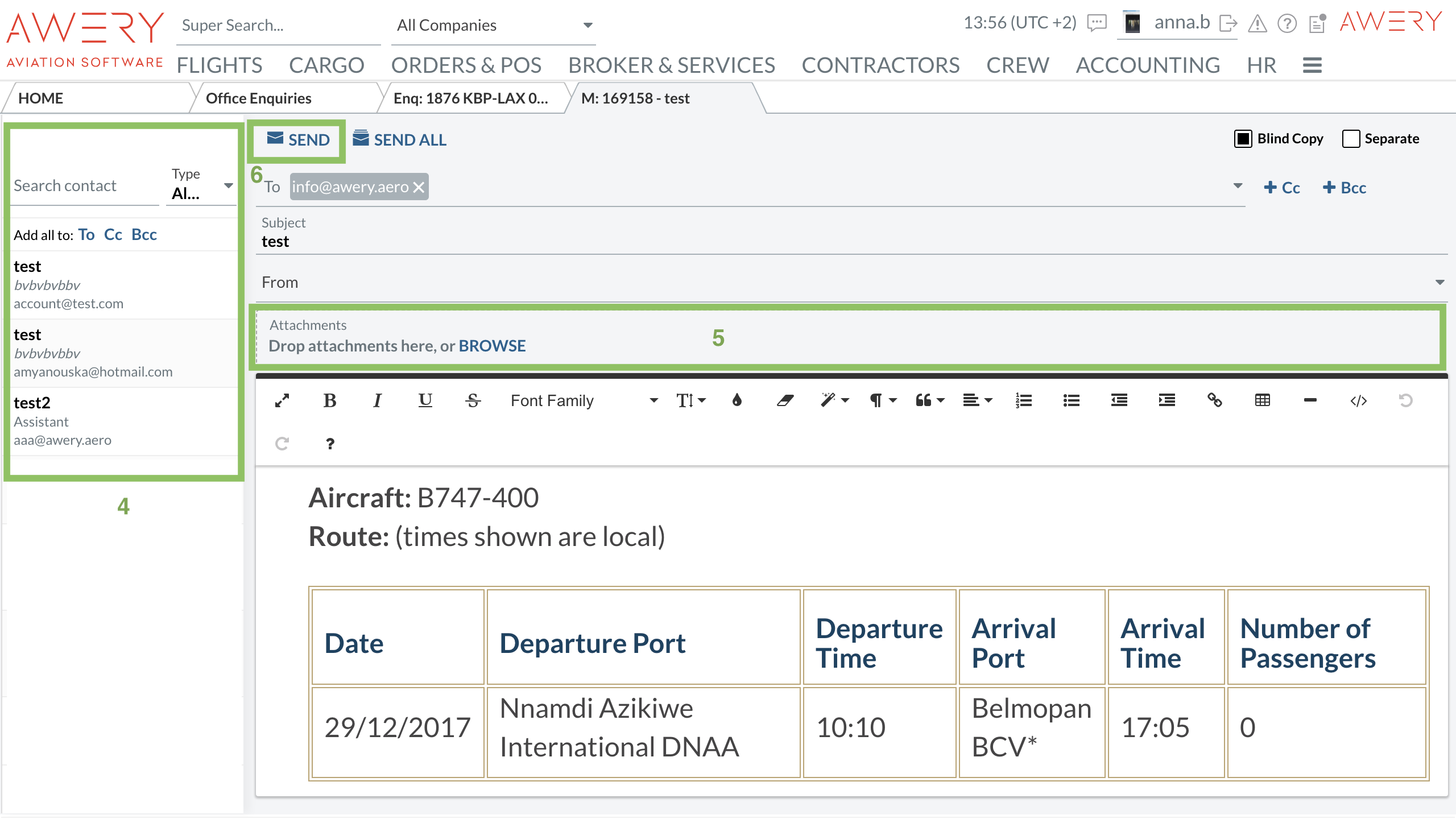 Due to wide feature set of Awery system you are able to send an email with Operator's Quote Request directly from the Enquiry.