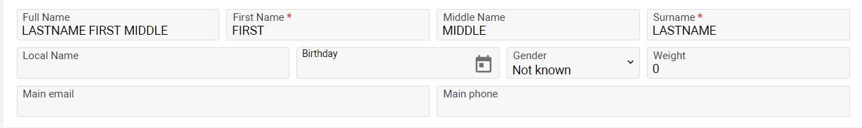 The First name, Middle Name, Surname, Local Name, Birthday, Weight, Main email, Main phone input fields