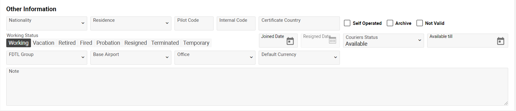 The Nationality, RESIDENCE, Couriers Status, FDTL Group, Base Airport, Office, Default Currency selectors