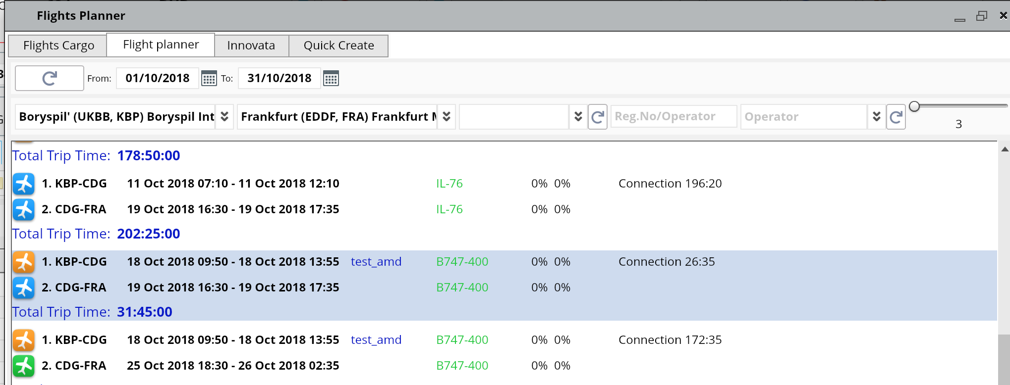 | This function will help to find the best connection for your AWB delivery within existing flights/trucks in the system. Direct flights/trucks with minimal connection will be shown first, then in ascending sort of the total trip time and quantity of connections. NB Origin and Destination are taken from AWB and picked up automatically. Filters by type of flight, registration number of aircraft and operator might be used. Use the slider to define the total flight/truck time preferred (from minimal existing). Select the flight/flights and press Plan |