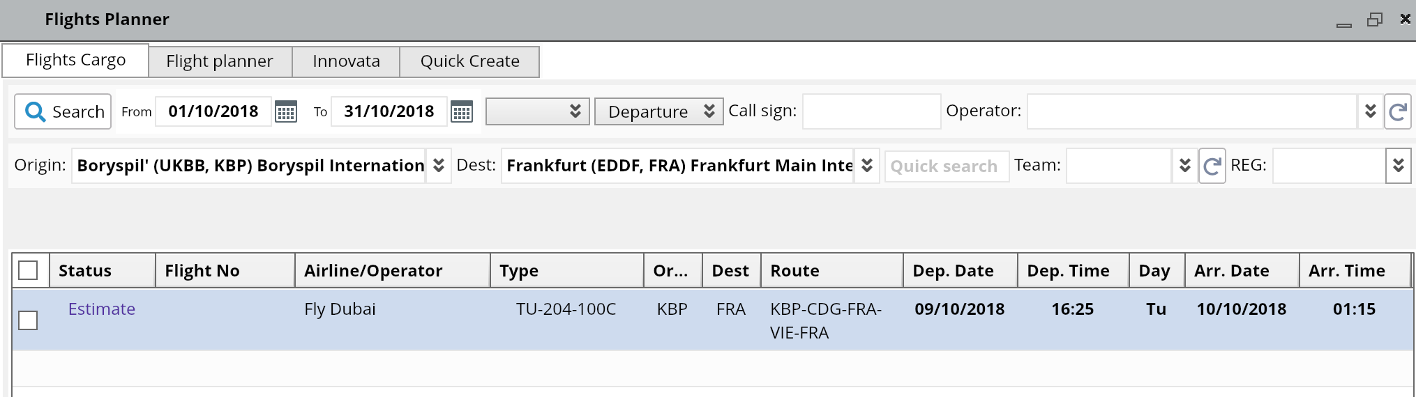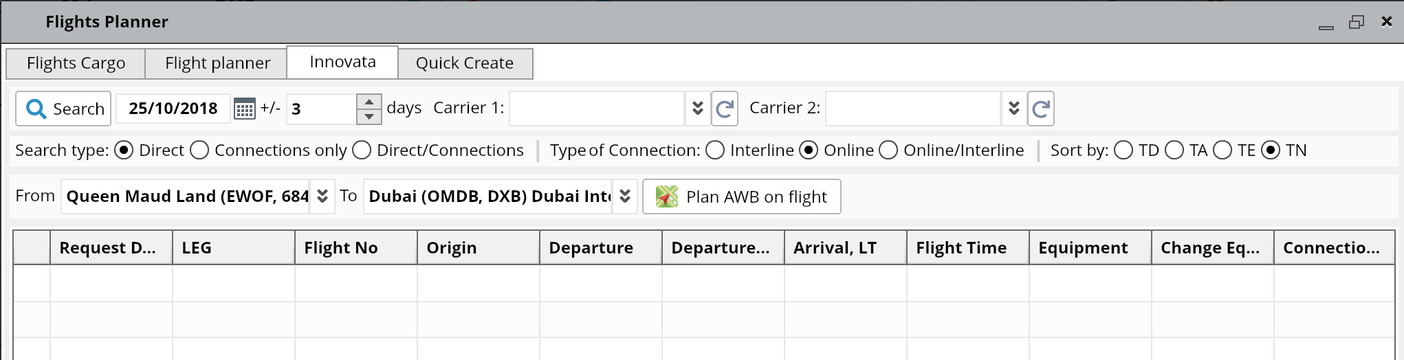 | If your system is connected to Innovata, the Innovata tab will be available and will show the list of flights/trucks received. The operator will be taken from the one selected in-stock company from AWB, origin, and destination from AWB. After the flight/truck is selected, press Put AWB on a flight. |