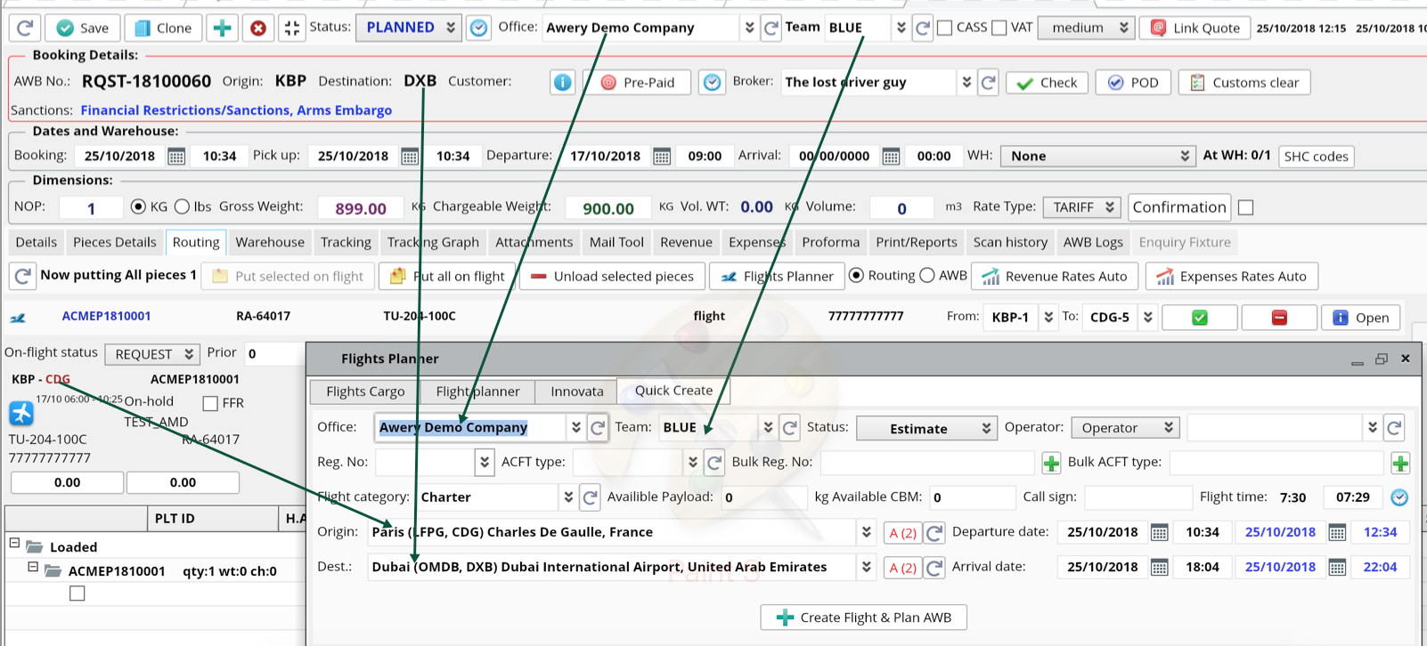 Planning on the flights/trucks and routing control can be done from several pages and tabs in system.