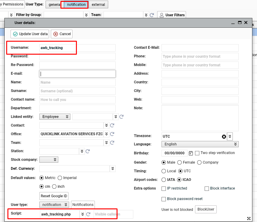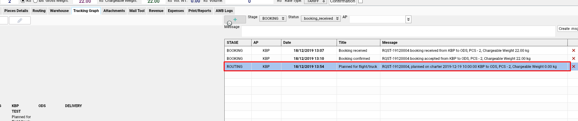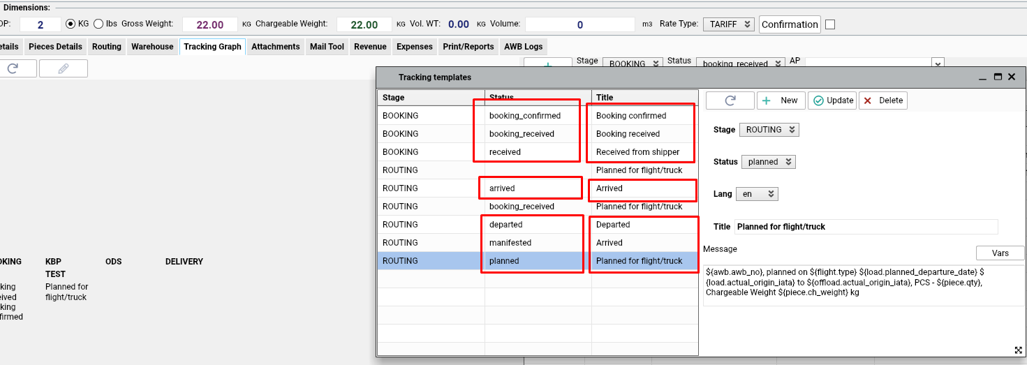 After any action is performed for AWB, the tracking message is created and available on the Tracking graph tab. The messages can be modified, by clicking here. Please check the Statuses and Titles to setup before AWB processing.