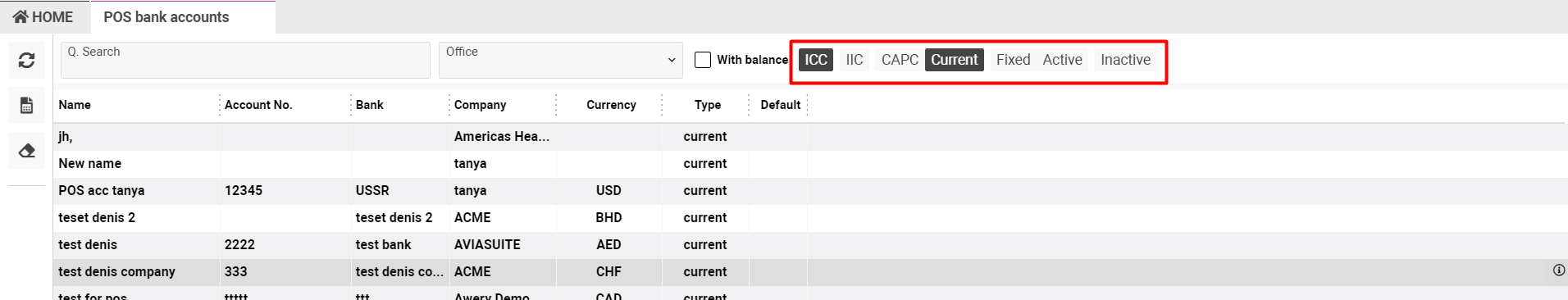You can filter your bank accounts by: