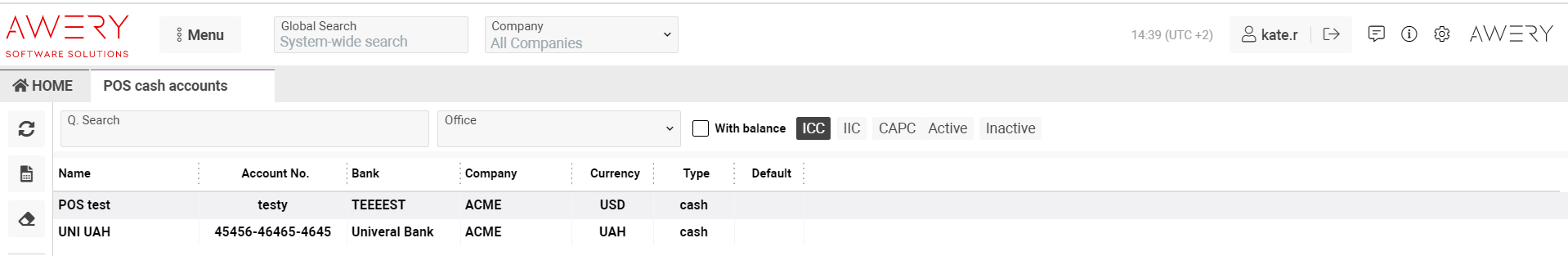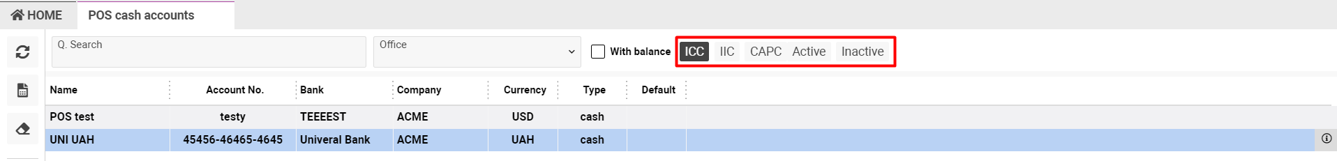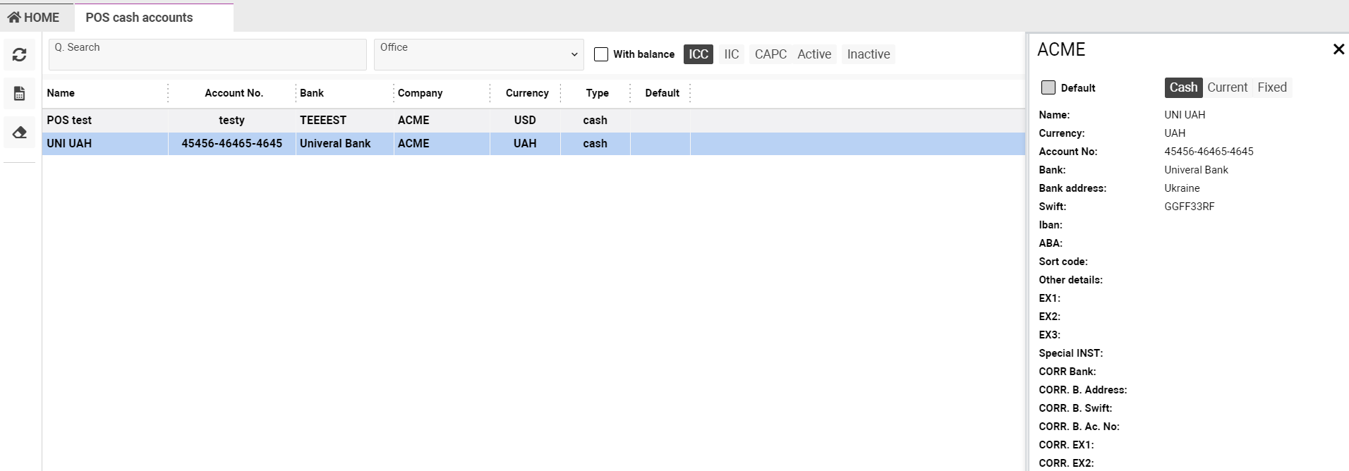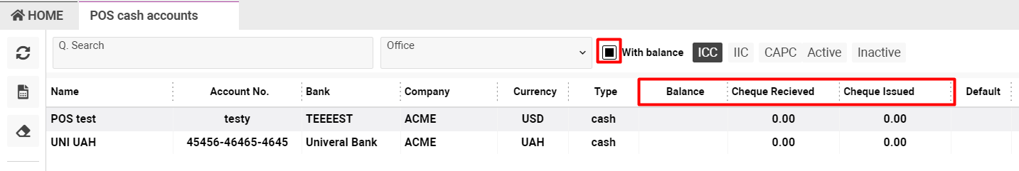 Also using the ‘With balance’ check-box you will see the list of cash accounts that have balanced and in the cash account table will be added one more column named Balance.