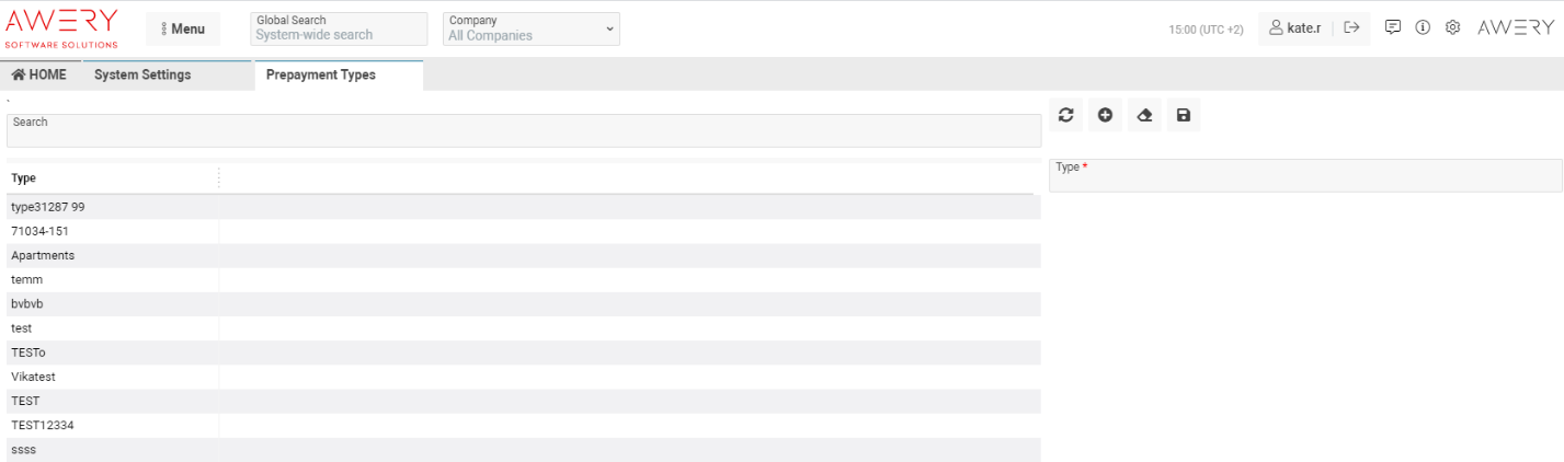 The Prepayment Types module allows users to create and edit different types of prepayment entries that can be used in financial transactions.
