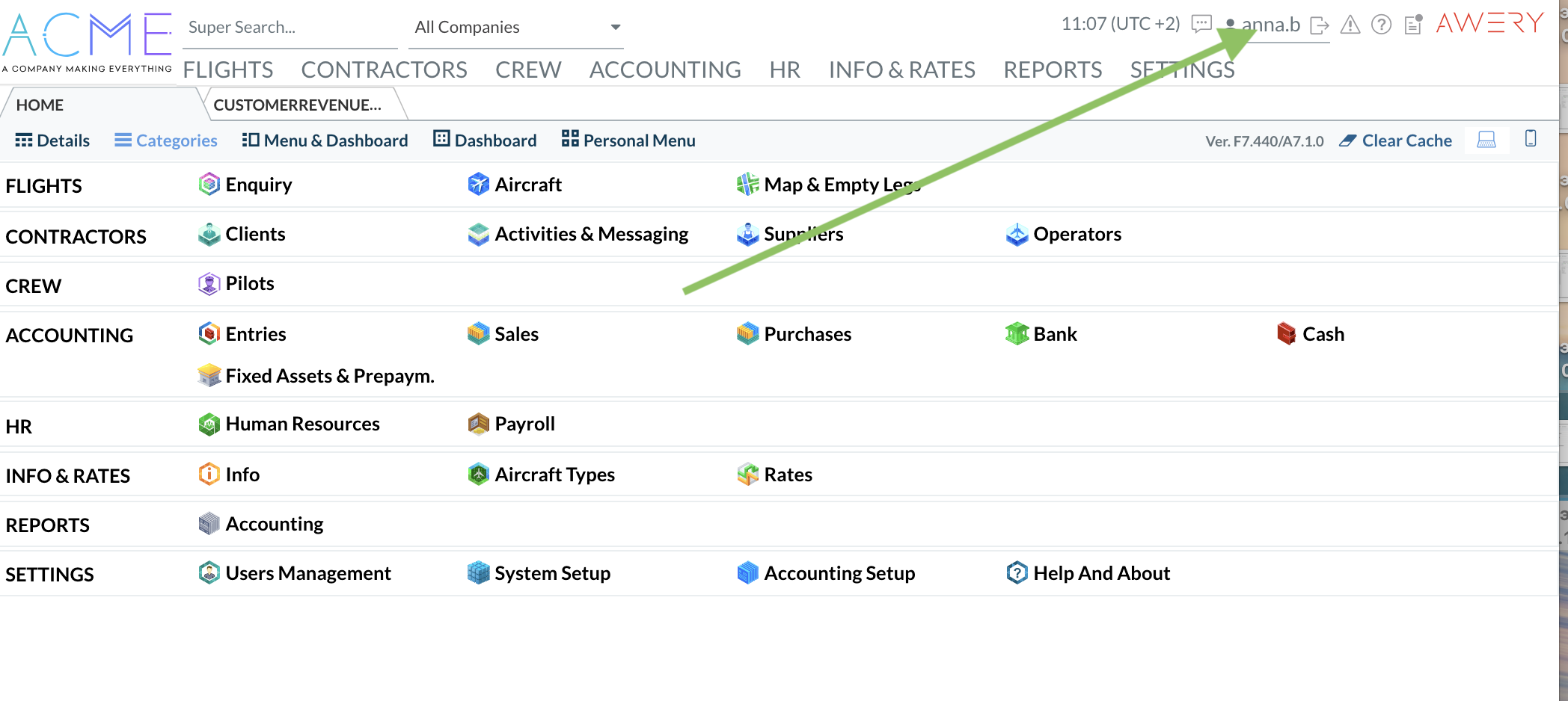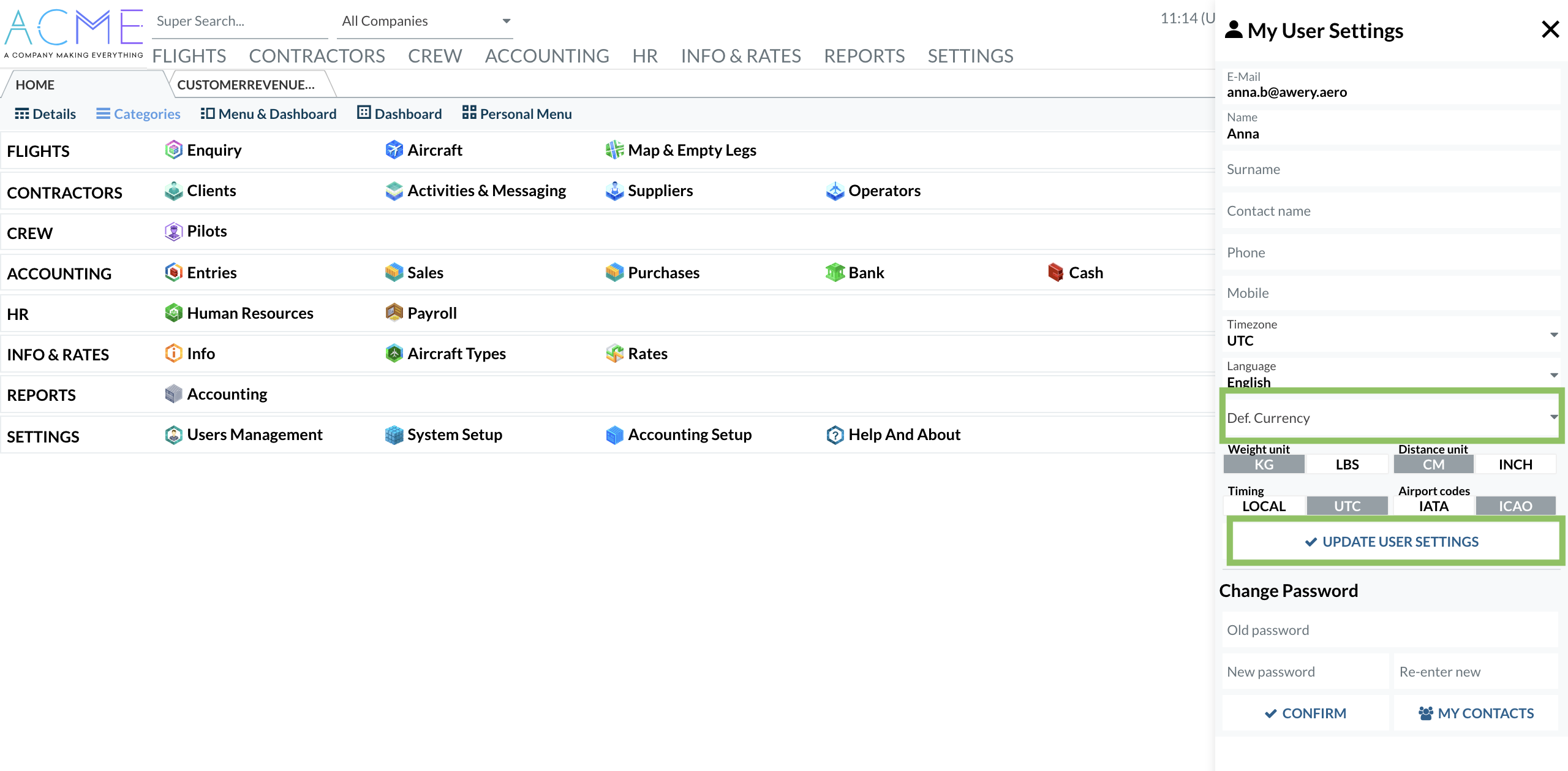 Main currency for Pricing can be set and changed in "My User Settings" window. Click on your login at Home page to see all parameters set as default.
